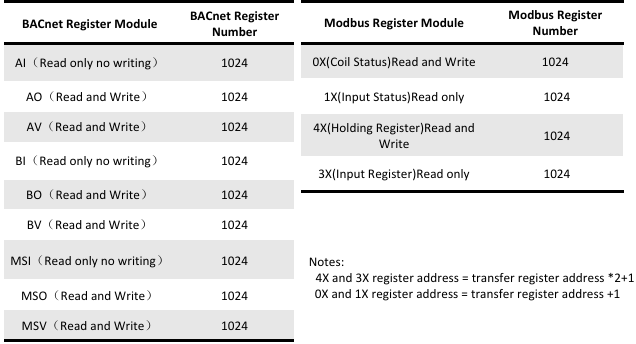 The BACnet/Modbus register types and maximum number of points supported are shown in the table below.