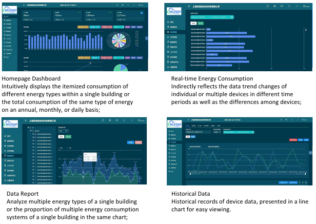 EMS gateway HMI1004-A64(EMS) can collect, measure, bill, save and classify data such as water, electricity, gas, cold/hot sources, etc., and has peak, off-peak, valley and flat period electricity consumption records. The data is presented intuitively in the form of tables, pie charts and bar charts.