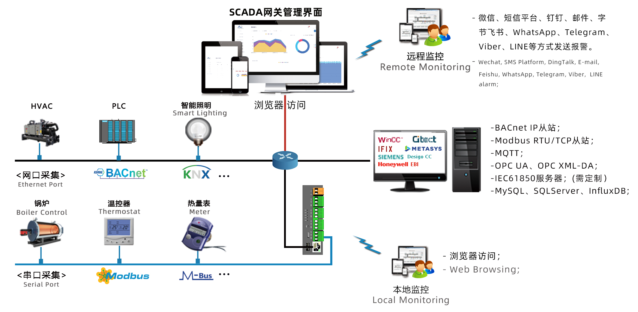 同时具微信报警、钉钉报警、邮件报警、短信平台报警、MQTT服务、工程上传云端等功能;支持本地存储InfluxDB时序数据库,也可以存储到外部MySQl数据库或SQL Server数据库;还可以转发为BACnet服务器、Modbus服务器、IEC61850服务器、OPC UA服务器、MQTT服务器,开放HTTP WEB服务被第三方的系统集成。)