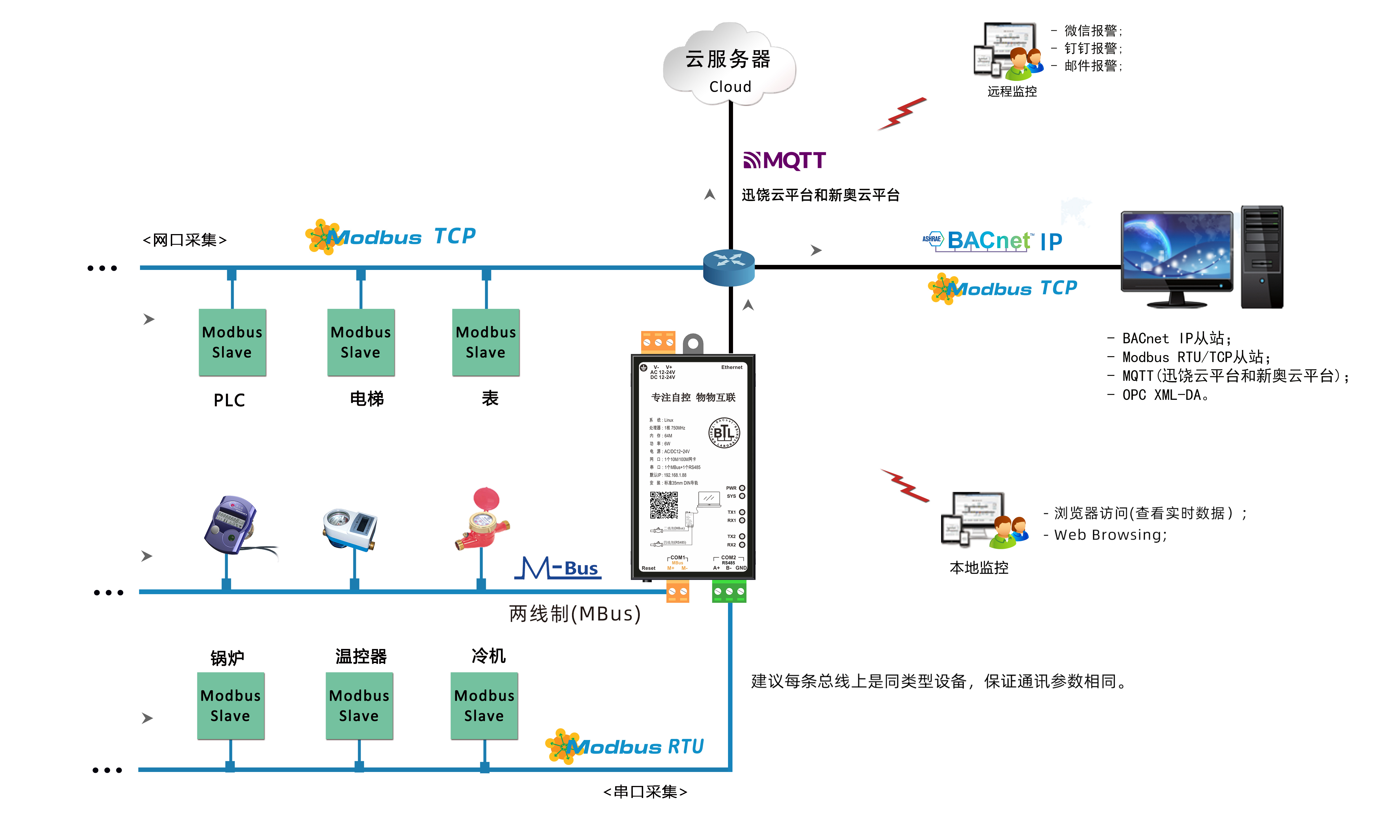 迅饶MBus物联网关HMI1011-MBus,有1个网口、1个MBus口、1个RS485串口),可以集成两线制和四线制MBus水表、能量表、热量表,DL/T645-1997/2007多功能电表或者Modbus协议的各种设备,同时也支持微信报警、钉钉报警、邮件报警,MQTT服务(支持迅饶云平台和新奥云平台)、工程上传云端等功能。