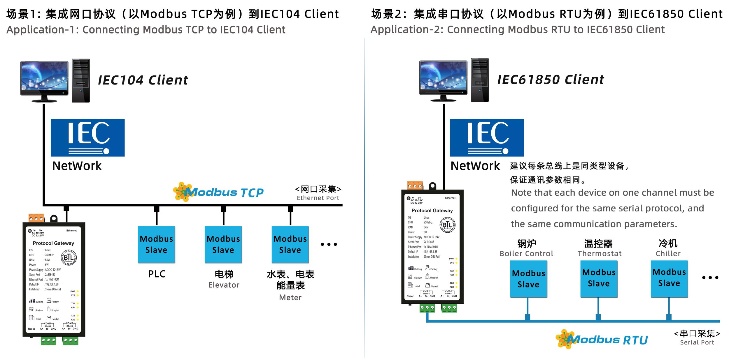 解决PLC、空调、电梯、消防、灯光控制系统、电表、水表不同产品,通过硬件网关将Modbus,BACnet等等其他各家不同的协议转换成IEC104规约或IEC61850规约,这样IEC客户端组态软件就可以通过X2IEC网关访问现场设备了,实现数据采集、数据监控、以及远程读取现场温度、报警状态等各种数据。